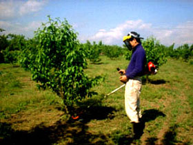 | 桃の木の周辺を、この刈払い機で雑草を刈り取ります。