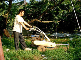 | 我が家は草生栽培の為、雑草がどんどん大きくなります。 その為同じ畑をこの機械で10日に1度は、刈り取ります。 炎天下での作業はさすがにこたえます。 |