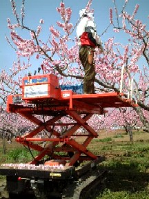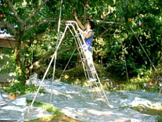| これを脚立といいます。 桃の摘蕾.摘花・摘果.袋かけ、収穫などに欠かせません。 一番上まで登るとそこそこの高さになります。 |